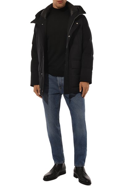 Для пошива черных ботинок мастера марки использовали мягкую гладкую кожу с легким блеском. Ей противопоставили такой же, только крупнозернистый материал, из которого выполнили вставки. Внутреннюю отделку выполнили из овчины с густым мехом. Роль акцента отдали брогированному узору, которым выделили мыс и стыки фигурных отрезов.