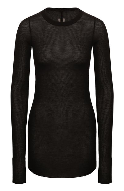 Черный пуловер облегает фигуру как вторая кожа, следуя каждому движению тела. Рик Оуэнс выбрал для изготовления модели нежный фактурный трикотаж — настолько тонкий, что изделие получилось полупрозрачным. В основе полотна — вискоза, произведенная из древесины возобновляемых лесов. Волокна шелка, в ключенные в состав, сделали пряжу еще мягче.