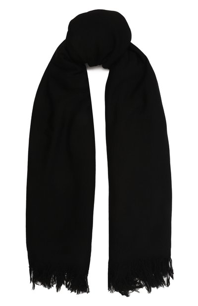 Черный шарф своими размерами больше напоминает плед. Тонкий трикотаж из шерсти первого пострига окутывает мягким согревающим облаком, а длины аксессуара хватит, чтобы нескол ько раз обернуть вокруг шеи или сформировать самый сложный узел. Края изделия декорировали густой бахромой.