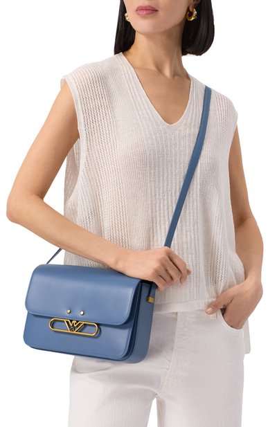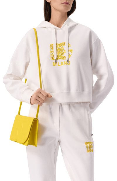 Небольшую сумку DG Logo из гладкой телячьей кожи дополнили внутренним карманом на молнии и съемным регулируемым плечевым ремнем. Клапан модели декорировали стеганой монограммой DG.