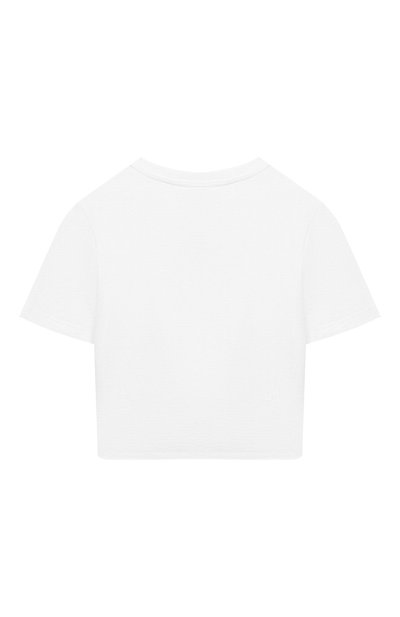 Белую однотонную футболку выполнили из мягкого джерси, произведенного из тщательно отобранных длинных волокон хлопка. Материал хорошо тянется, обеспечивая свободу движения и позволяет коже дышать. Спереди модель украсили объемной монограммой из серебристого металла и фактурным узлом на подоле, формирующим легкую драпировку.