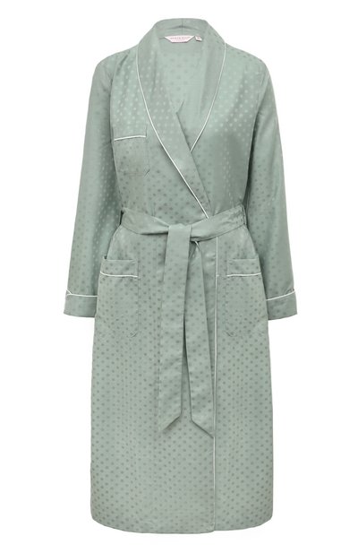 Зеленый халат с жаккардовым узором в крупный горох сшили из дышащей ткани на основе премиального хлопка. Его волокна в мягкости, прочности и гладкости не уступают шелку, поэтому материал получился особенно приятным на ощупь и не раздражает даже чувствительную кожу. Модель с широким шалевым воротником дополнили поясом-лентой, регулирующим глубину запаха и посадку на талии.
