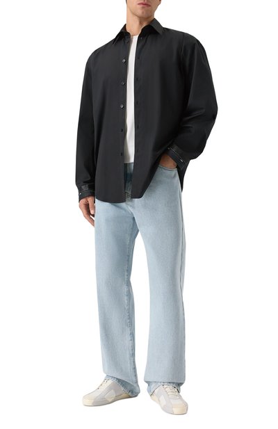 Прямая черная рубашка с отложным воротником и молнией вместо пуговиц в прохладную погоду сможет заменить легкую куртку. Для пошива модели мастера марки использовали прочный хлопковый габардин, который не продувается ветром. Изделие с фирменной линзой на левом рукаве окрасили в готовом виде, поэтому оно приобрело слегка неравномерный оттенок.