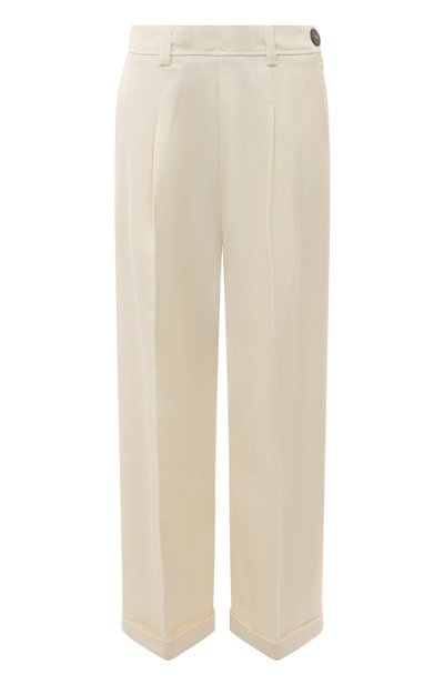 Кремовые лаконичные брюки с классической посадкой, двумя врезными карманами и широкими отворотами выполнены из гладкой легкой ткани на основе шелковистой вискозы и нежного премиального кашемира. Мягкий материал хорошо пропускает воздух и почти не мнется, а четкие стрелки визуально вытягивают силуэт.