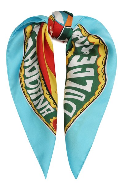 Для изготовления голубого платка Доменико Дольче и Стефано Габбана выбрали мягкий струящийся твил из нежных волокон шелка. Аксессуар украсили символичным для марки психоделическим мотивом Carretto, раскрашенным в ярких цветах экспериментального искусства 1960-х. Изделие легко драпируется, при этом долго сохраняет безупречную форму.