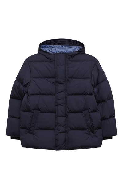Темно-синий пуховик выполнили из прочного легкого нейлона. Такой материал не боится ветра, поэтому в изделии будет комфортно в холодные дни. Модель утеплили слоем отборного утиного пуха и пера, которые распредели ли по стеганым камерам. Объемный капюшон и штормовая планка дополнительно защищают от капризов погоды.