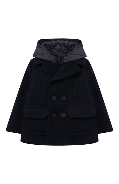 Крой темно-синего пальто дизайнеры марки позаимствовали у двубортного пиджака с широкими лацканами. Для пошива модели использовали плотный непродуваемый текстиль. Изделие дополнили утепленным жилетом из стеганого материала с шелковистым блеском. Такой комплект станет идеальным вариантом для капризной погоды межсезонья.