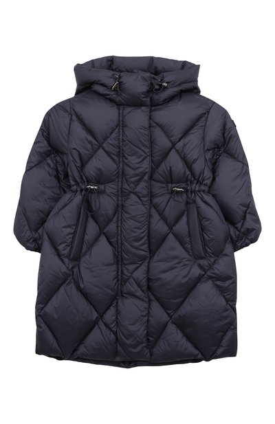 Синее пальто с ромбовым стеганым мотивом мастера марки сшили из легкого шелковистого нейлона, который не продувается ветром. Модель утеплили отборным пухом, не утяжеляющим изделие. Дополнительную защиту от ветра и холода обеспечивает глубокий капюшон, а пояс-кулиска фиксирует посадку на талии.