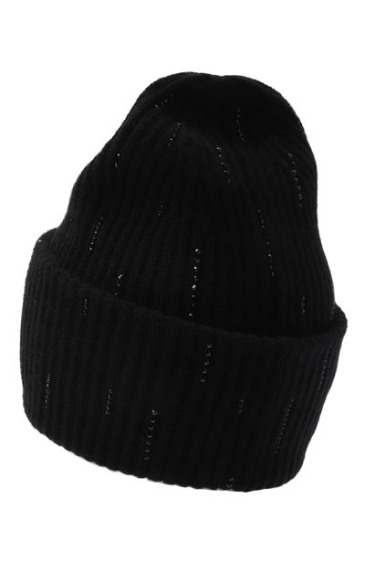 Черную шапку связали фактурной резинкой из кашемировой пряжи. Широкий отворот декорировали стразами в тон изделию. Модель мягко облегает голову и сохраняет тепло.