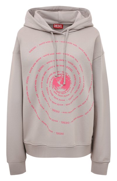 Для пошива серого худи свободного кроя мастера марки использовали мягкий трикотаж из органического хлопка, выращенного с бережным отношением к природе. Материал с уютной петельчатой изнанкой хорошо удерживает тепло, обеспечивая комфорт в прохладную погоду. Яркость изделию добавляет крупный розовый принт в виде спиральной надписи Diesel World Wide Dance и изображения Земли.