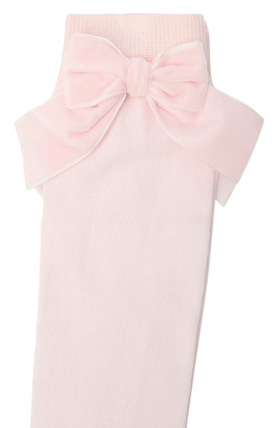 Гольфы с плоским швом на мысе выполнили из хлопковой пряжи, укрепленной полиамидом. Аксессуар с широкой манжетой украсили крупным бархатным бантом.