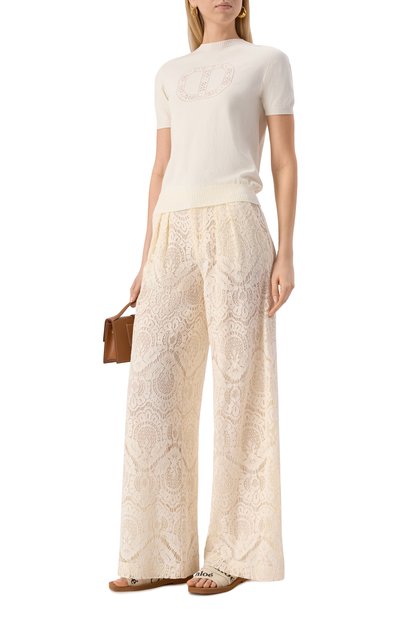 Свободные пляжные брюки с эластичным поясом почти не скрывают тело. Боковые разрезы полностью обнажают ноги при каждом шаге, а фирменный ажурный трикотаж, больше похожий на кружево, делает модель полупрозрачной. Струящийся материал с узором в оттенках белого и слоновой кости выполнили из микса шелковистой вискозы с купро и усилили нитями полиэстера.