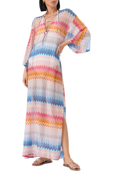 Туника с V-образным вырезом, глубина которого регулируется корсетной шнуровкой, почти не ощущается на теле. Легкой, исключительно приятной на ощупь и комфортной модель с короткими рукавами делает ажурный трикотаж с разноцветным зигзагообразным узором, связанный из шелковистой вискозы. Ламинированные нити в составе пряжи придают изделию сияние.