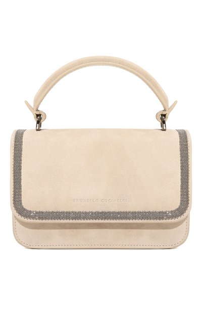 Для изготовления светло-бежевой сумки мастера бренда, основанного Брунелло Кучинелли, использовали тщательно выделанную замшу, устойчивую к поте ртостям и царапинам. Клапан модели украсили тисненым логотипом марки и отделкой из деликатно мерцающей цепочки мониль. Внутри хватит места для кошелька, смартфона и губной помады. В комплекте — плечевой ремень.
