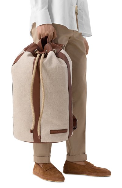 Белый рюкзак Street мастера марки, основанной Брунелло Кучинелли, сшили из фактурного полухлопкового текстиля, а для отделки использовали матовую кожу насыщенного коньячного оттенка. Подклад из водоотталкивающего материала защитит содержимое от внезапного дождя. Помимо вместительного основного отдел ения у аксессуара предусмотрели внешние карманы: открытые и на молниях.