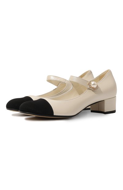 Для пошива туфель кремового оттенка использовали два вида материала: основой сделали зернистую кожу с сатиновым блеском, а круглый мыс подчеркнули фактурным текстилем черного цвета. Чтобы в обуви было комфортно весь день, а нога находилась в анатомически правильном положении, предусмотрели устойчивый каблук и узкий ремешок с золотистой пряжкой на подъеме.