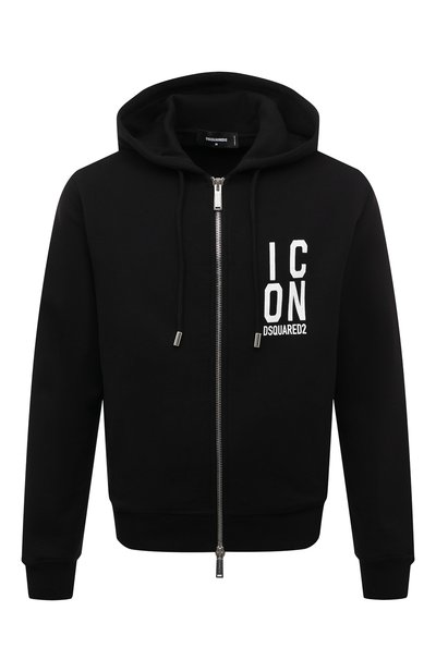 Черная толстовка с регулируемым капюшоном защитит от холода и ветра в прохладную погоду, взяв на себя роль легкой куртки. Тепло и комфорт обеспечит мягкий хлопковый трикотаж с плотным переплетением волокон. Модель, застегивающуюся встречной молнией, украсили белой крупной надписью Icon в сочетании с логотипом, заявляющей о принадлежности марке.