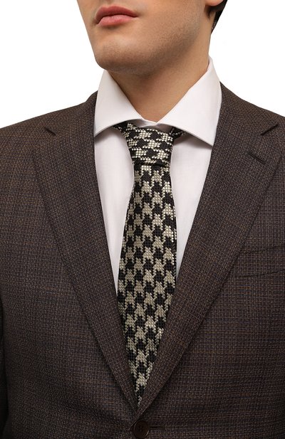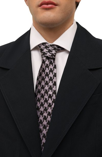 Для пошива бледно-фиолетового галстука в крупную клетку «принц Уэльский» использовали прочный фактурный шелк с характерным деликатным блеском. Материал не вытягивается и не подвержен пилингу, поэтому аксессуар будет долго выглядеть безупречно. Благодаря эластичному заднему шву ручной работы модель легко укладывается в узел и не перекручивается.