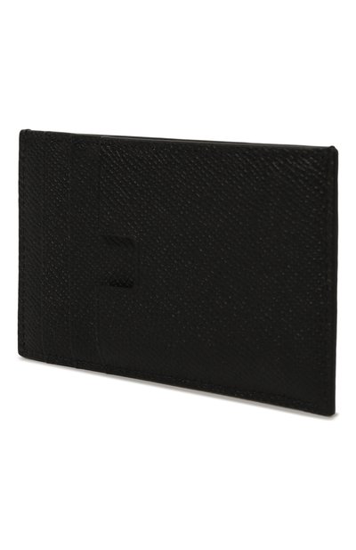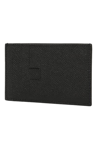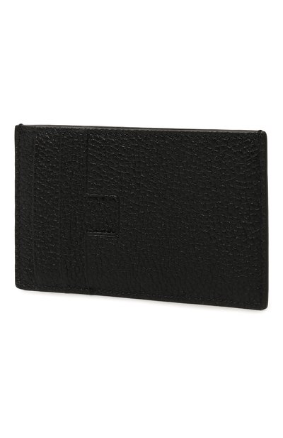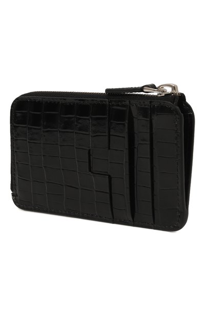 Для изготовления черного футляра использовали мягкую лакированную кожу с тиснением под крокодила. Переднюю панель декорировали миниатюрным золотистым логотипом, а вырез слота для банковской карты выполнили в форме знаковой литеры T, обозначив принадлежность модели бренду. Аксессуар дополнили карманом с молнией сверху, кольцом для ключей и карабином для крепления к сумке или рюкзаку.