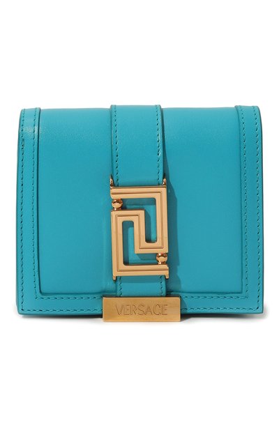 Бирюзовое портмоне с пятью слотами для пластиковых карт и карманом, застегивающимся молнией, дополнено съемным плечевым ремнем с фирменными золотистыми цепочками Greca. Небольшой аксессуар из прочной матовой кожи украшен крупной пряжкой-меандром и пластиной с логотипом марки.
