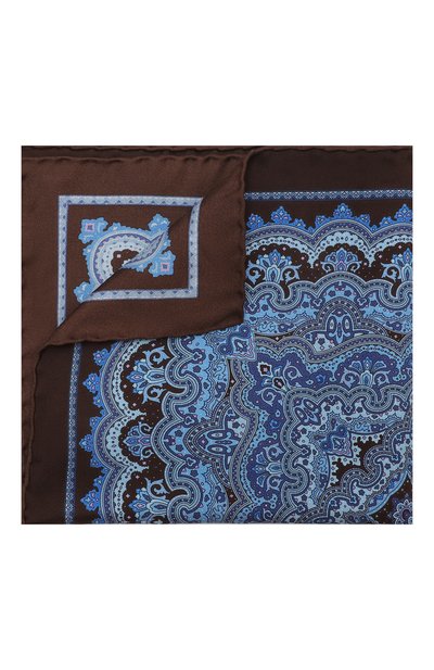 Синий сложносочиненный узор на коричневом платке выполнили так, что он визуально кажется объемным. Для изготовления аксессуара мастера марки использовали тонкий шелковый твил, который после складок быстро восстанавливает форму.