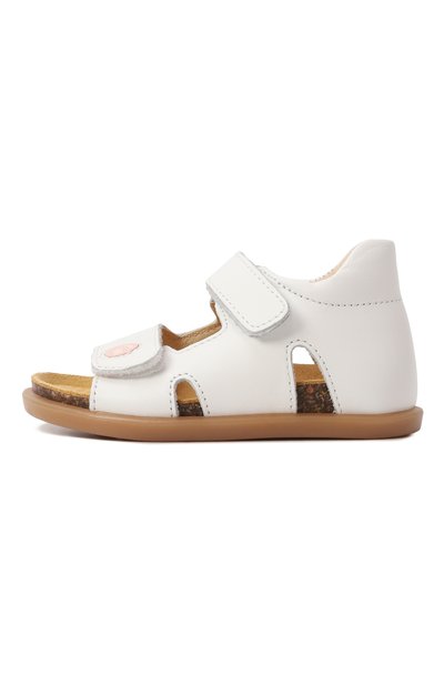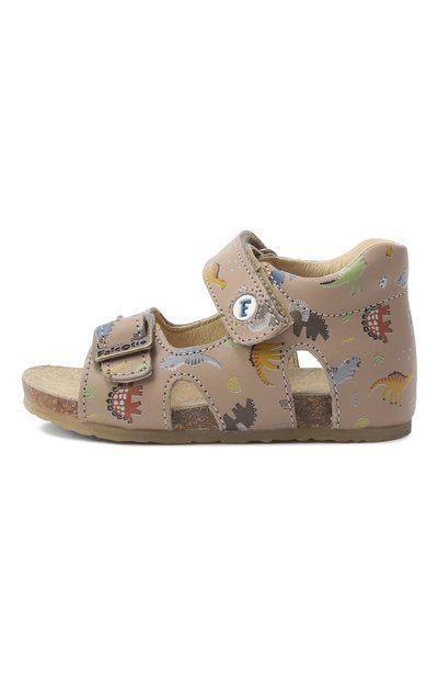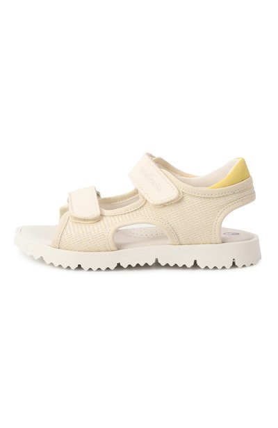 При изготовлении золотистых сандалий основное внимание уделили комфорту. Мыс выполнили из переплетенных полос металлизированной кожи тонкой выделки. Плотный задник и анатомическая стелька фиксируют ногу в правильном положении. Посадку обуви удобно регулировать ремешком-велкро с заклепкой, украшенной эмблемой бренда.