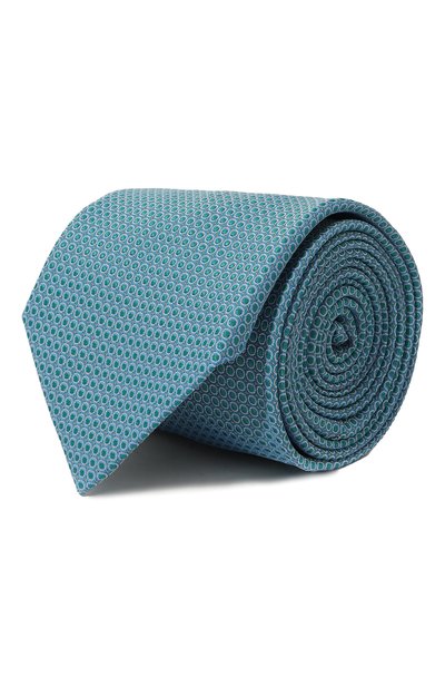 Галстук бирюзового оттенка добавит ярких красок в образ. Аксессуар с гороховым микроузором в тон, создающим эффект 3D, изготовили вручную из мягкого шелкового жаккарда с деликатным блеском. Длины изделия средней ширины хватит, чтобы завязать сложный виндзорский узел.