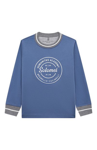 Для пошива синего лонгслива с серой меланжевой отделкой на манжетах и горловине мастера марки использовали мягкое джерси из длинноволокнистого хлопка. Он прочнее, тоньше и эластичнее обычного, поэтому изделие получилось особенно приятным на ощупь и не сковывает движения. О принадлежности модели бренду говорит крупный принт спереди.