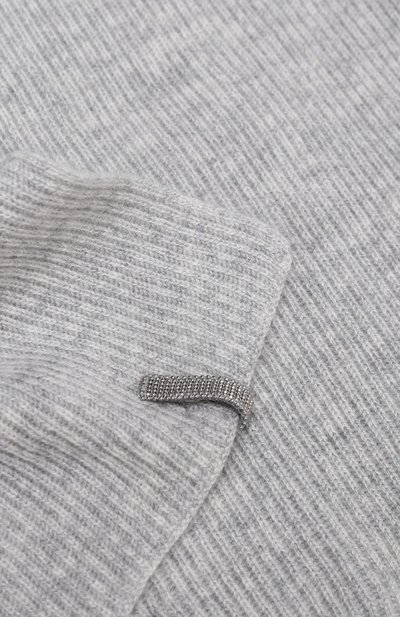 Для изготовления широкого шарфа рельефной вязки использовали пряжу из чистого кашемира. Длинный аксессуар декорировали небольшой петлей, расшитой цепочками мониль.