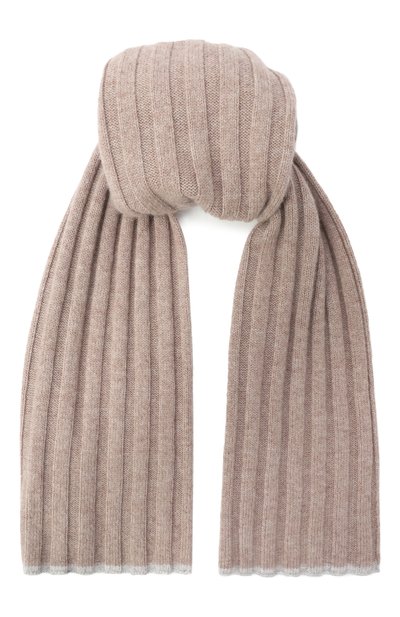 Меланжевый шарф в рельефную полоску связали из ворсованной кашемировой пряжи. Концы аксессуара подчеркнули узкими контрастными линиями.