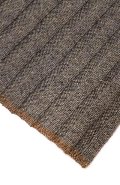 Для изготовления широкого шарфа крупной фактурной вязки использовали кашемировую пряжу, поддерживающую оптимальный микроклимат и не вызывающую раздражение на коже. Края аксессуара дополнили узким контрастным кантом.