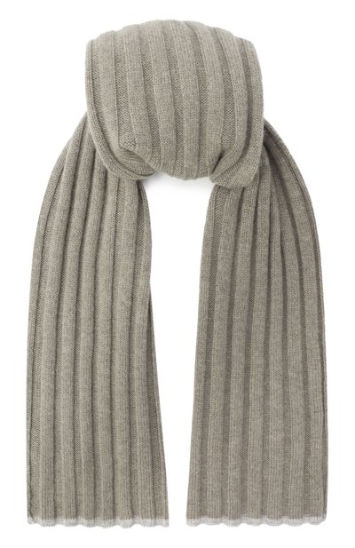 Для изготовления длинного шарфа использовали ребристый трикотаж из чистого кашемира. Края аксессуара подчеркнули узким контрастным кантом.