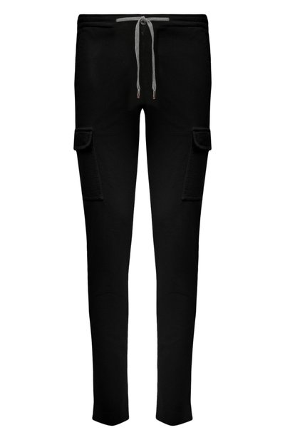 В основе брюк черного цвета лежат карго, что читается в характерном прямом силуэте, боковых накладных карманах и кулиске со шнуром на эластичном поясе, но изделие не выглядит стандартно. Все дело в материале — вместо привычной хлопковой саржи для пошива использовали плотный вельвет-корд (его узор чуть крупнее, чем на обычном).
