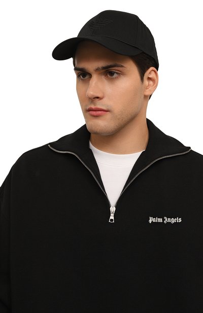 В черной бейсболке с объемным тотемным орлом будет комфортно как в ясные дни, так и в непогоду. Аксессуар сшили из в меру плотного хлопкового габардина, по этому он получился одновременно дышащим и непродуваемым. Тонкий подклад также помогает циркуляции воздуха, а полимерная лента сзади регулирует посадку.