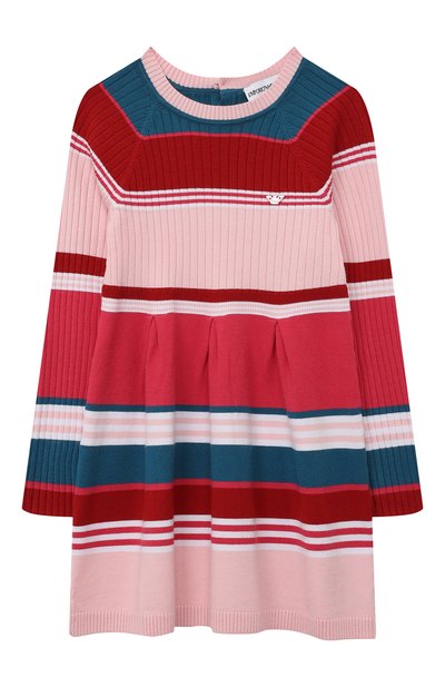 Мастера марки выполнили розовое платье из приятного на ощупь трикотажа. Для лифа использовали фактурный материал, а подол изготовили из гладкого, объединив их ярким узором в полоску. Материал на основе вискозы и полиэстер получился дышащим и прочным. Спереди изделие украсили эмблемой бренда.