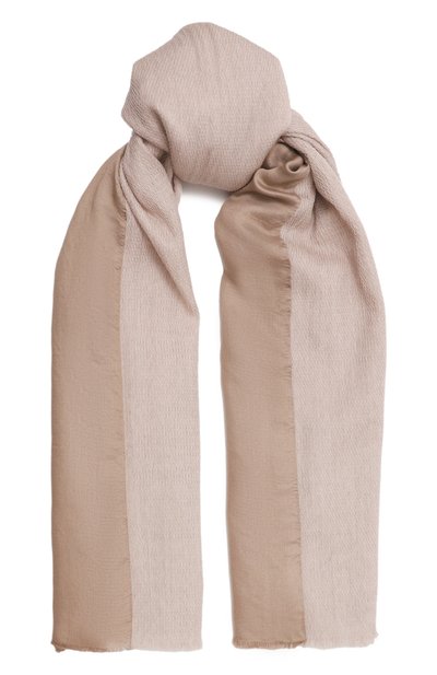 При создании этого широкого шарфа использовали материалы с разной фактурой, объединив их в технике color block схожей нейтральной гаммой. Модель собрали из широких полос с рельефным узором, с шелковистой гладкой поверхностью и с бархатистой структурой. Отрезы выполнили из шерсти virgin, вискозы и шелка с добавлением полиамида.