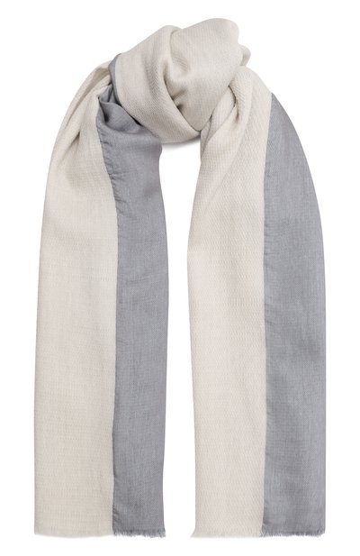 Голубой шарф выполнили в технике color block, гармонично соединив полосы не только разных оттенков, но и фактур. Для создания широкого аксессуара использовали нити нежного шелка, тонкой вискозы и ворсистой шерсти. Такая модель приятно ощущается на коже и поддерживает оптимальную температуру. Края подчеркнули естественной бахромой.