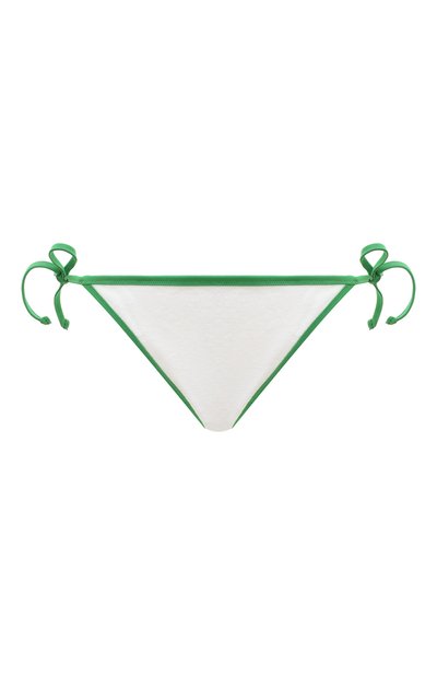 Для изготовления кипенно-белых плавок использовали мягкий махровый материал на основе хлопка, который укрепили полиамидом. Изделие из такого текстиля приятно ощущается на теле. Края подчеркнули зеленым узким кантом, в тон которому выполнили узкие ленты по бокам.