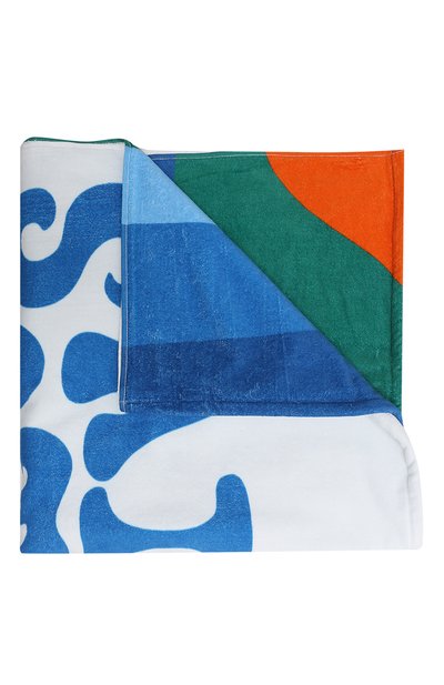 Для изготовления большого пляжного полотенца использовали мягкий, исключительно приятный на ощупь текстиль из нежного хлопка. Махровый материал мгновенно впитывает влагу и быстро сохнет. Особенно ярким белый прямоугольный аксессуар делает разноцветный пейзажный принт, дополненный логотипом.