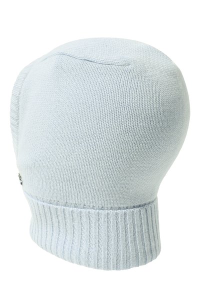 Мастера марки выполнили голубую шапку из нежного трикотажа, связанного из премиальной шерсти и мягкого кашемира. Чтобы изделие лучше защищало уши от ветра, у аксессуара предусмотрели широкий отворот. Модель декорировали пушистым помпоном из меха уссурийского енота, окрасив этот материал в тон.