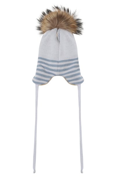 Для изготовления светло-серой шапки, завязывающейся длинными лентами, мастера марки использовали нежную шерсть с добавлением особенно мягкого кашемира. Такой материал не колется и хорошо сохраняет тепло. Аксессуар украсили крупным коричневым помпоном из меха уссурийского енота.