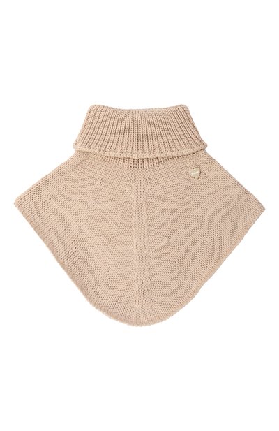 Шарф-манишку связали из чистой шерсти. Модель с высокой эластичной горловиной с отворотом декорировали золотистой подвеской-сердцем с логотипом.