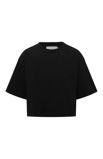 Черная укороченная футболка свободного кроя выполнена из дышащего хлопкового джерси с гладкой шелковистой поверхностью. Легкая модель с круглым вырезом и широкими рукавами украшена тисненым рельефным логотипом бренда. Наши стилисты предлагают создать образ с серыми джинсами, коричневой сумкой, курткой и кедами в тон изделию.