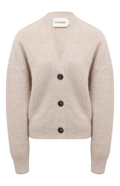 Слегка укороченный серый кардиган со спущенной линией плеч и V-образным вырезом связали рифленым узором из мягкой шерсти с добавлением нежного пуха альпака, который особенно хорошо сохраняет тепло. Чтобы изделие не вытягивалось и не пилинговалось, в состав пряжи включили прочный шелковистый полиэстер. Модель из такого материала приятно ощущается на коже, поэтому мы предлагаем носить ее на голое тело, дополнив образ карго и кедами.