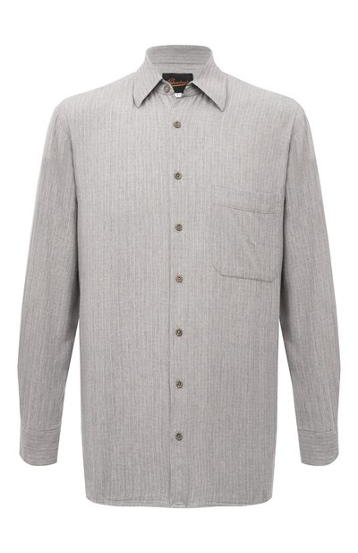 Свободную серую рубашку в едва заметную узкую полоску мастера марки сшили из мягкого дышащего хлопка. Материал с шевронным переплетением нитей хорошо пропускает воздух и почти не мнется, а чтобы изделие не вытягивалось после стирок, в состав добавили прочные волокна полиэстера. Модель с отложным воротником дополнили накладным нагрудным карманом.