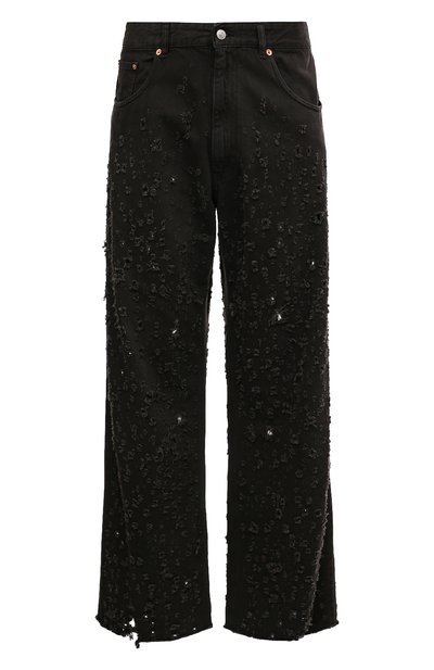 При создании черных широких джинсов с классической посадкой команда марки уделила особое внимание декору. Модель обработали в готовом виде до появления на плотной хлопковой ткани многочисленных потертостей и затяжек, придающих брюкам состаренный вид. Принадлежность бренду обозначили белоснежным патчем на поясе сзади.