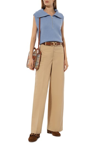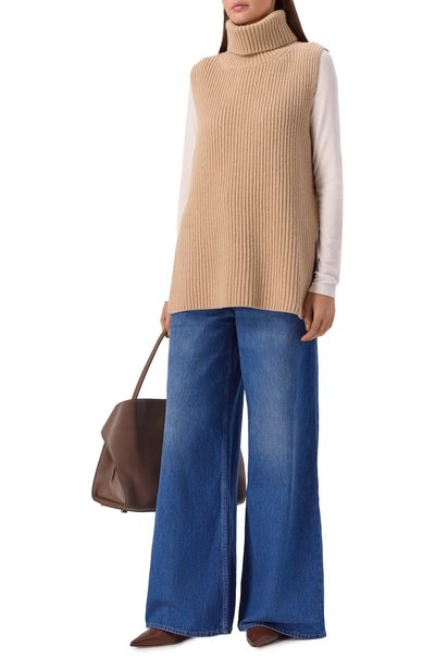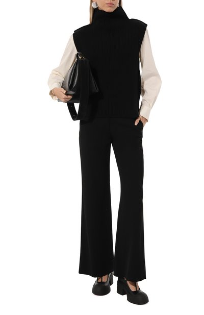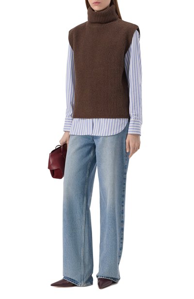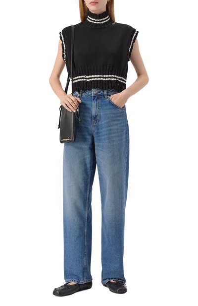 Укороченный жилет со спущенными петлями и выступившими нитями, придающими модели винтажный вид, связали из мягкой хлопковой пряжи. Высокую горловину украсили вышитым логотипом бренда. Изделие добавит выразительности повседневным образам с джинсами или юбками.