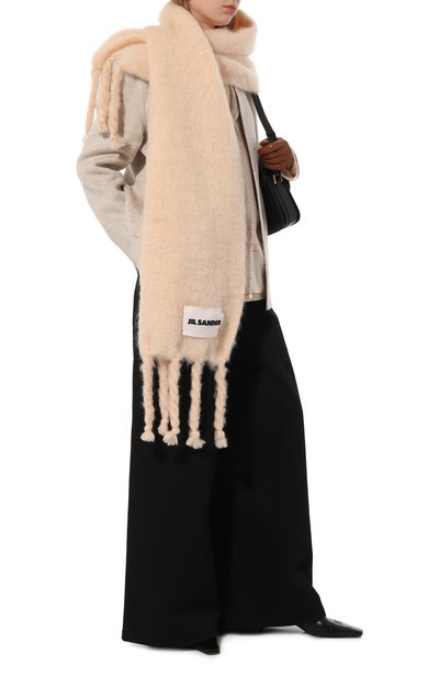 Для изготовления шарфа с крупным жаккардовым логотипом в центре использовали мягкую пушистую пряжу на основе мохера, шерсти овцы и альпака. В состав материала добавили нейлон, сделав его прочнее. Края украсили витой бахромой.