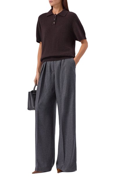 Темно-синее поло с узким полосатым узором вдоль края отложного воротника получилось приятным на ощупь, теплым и при этом легким. Для изготовления модели с короткими рукавами мастера марки, основанной Брунелло Кучинелли, использовали нежный отборный кашемир. Чтобы сделать пряжу прочнее, в состав добавили вискозу, а за деликатное мерцание отвечают металлизированные волокна.