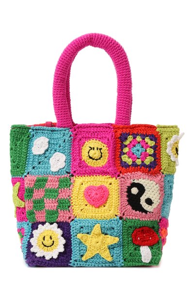 Небольшую сумку с двумя короткими ручками выполнили в технике кроше из мягкой, но прочной пряжи. Нитями разных оттенков создали фактурные квадраты, в каждом из которых вывязали разные фигуры, орнаменты и символы. Чтобы из ажурного аксессуара не выпадали мелкие предметы, его дополнил и плотной подкладкой с карманом.